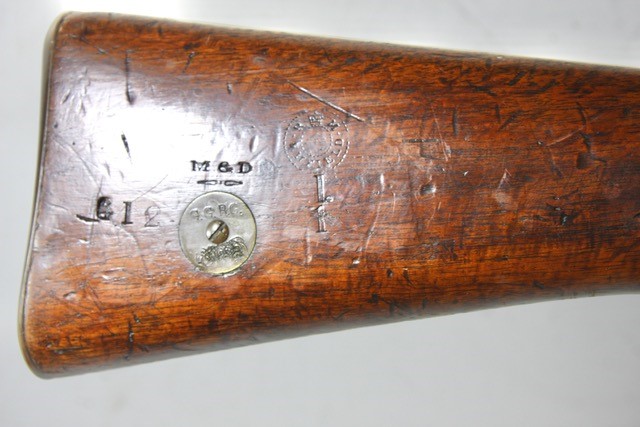 Enfield 1896 manufacture. Bolt number is not matching. All other numbers match. Canadian issue M&D cartouche. Butt disc marked to Governor Generals Body Guards (GGBG). Bore appears very good, slightly frosty, strong rifling, tight muzzle. Complete with reproduction cleaning rod. Leather rear sight cover and screws have been removed.
