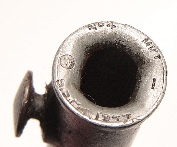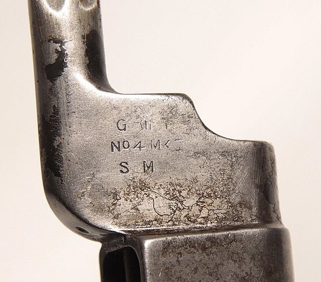 Original and correctly marked with G Crown M, No. 4 Mk I and SM for Singer (sewing machine) Manufacturing. Some fading of letters on the right of marking. First model of “spike” bayonet for No. 4 Mk 1 rifle these bayonets saw extensive use. Very good condition overall with well marked 1944 dated steel scabbard.