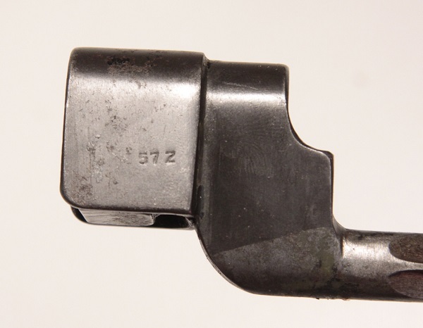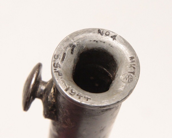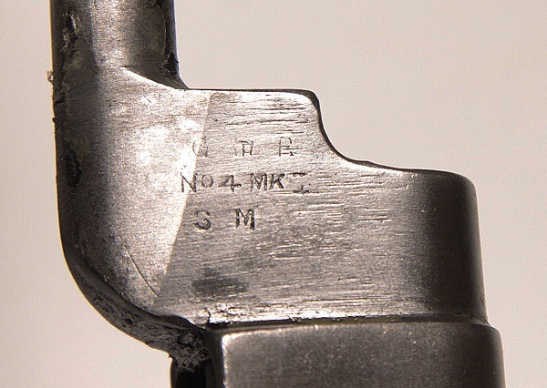 Original and correctly marked with G Crown M, No. 4 Mk I and SM for Singer (sewing machine) Manufacturing. Some fading of letters as this bayonet appears to have been arsenal refurbished. First model of “spike” bayonet for No. 4 Mk 1 rifle these bayonets saw extensive use. Very good condition overall with well marked 1944 dated steel scabbard.