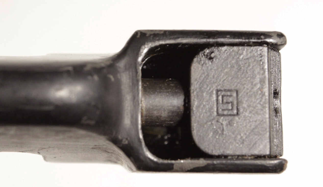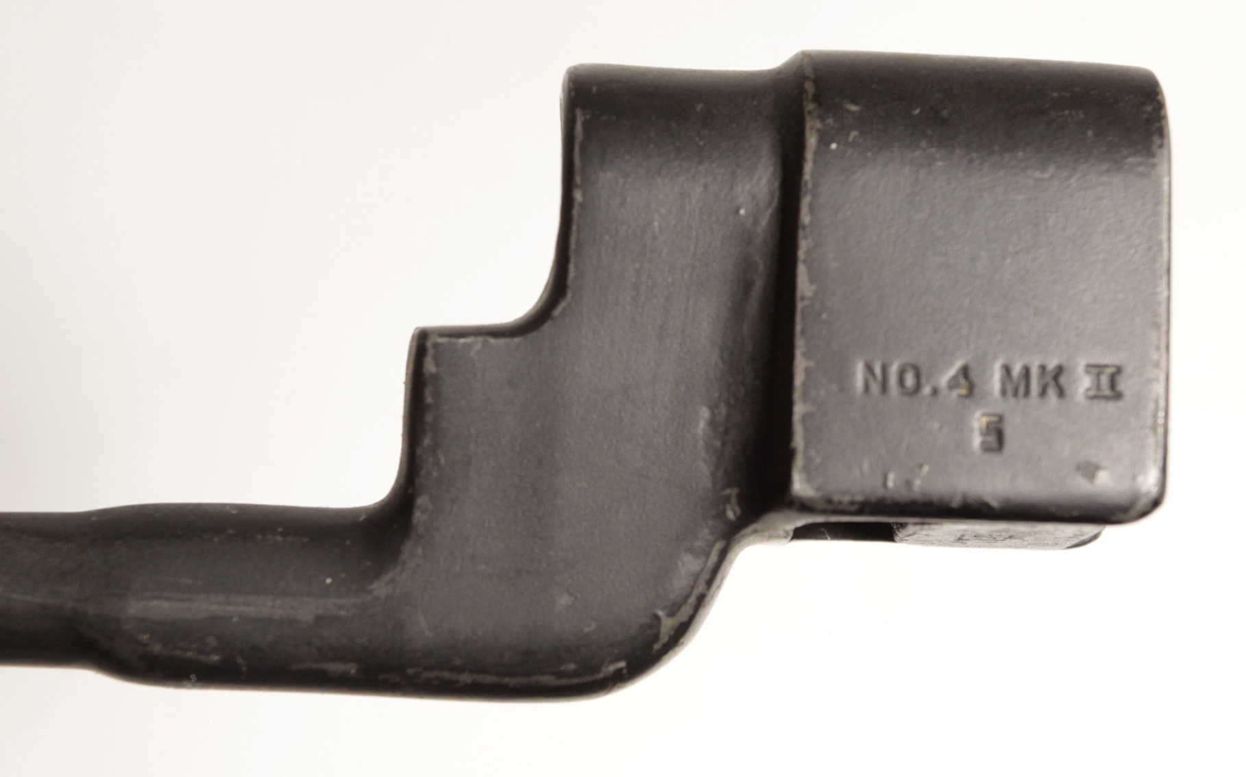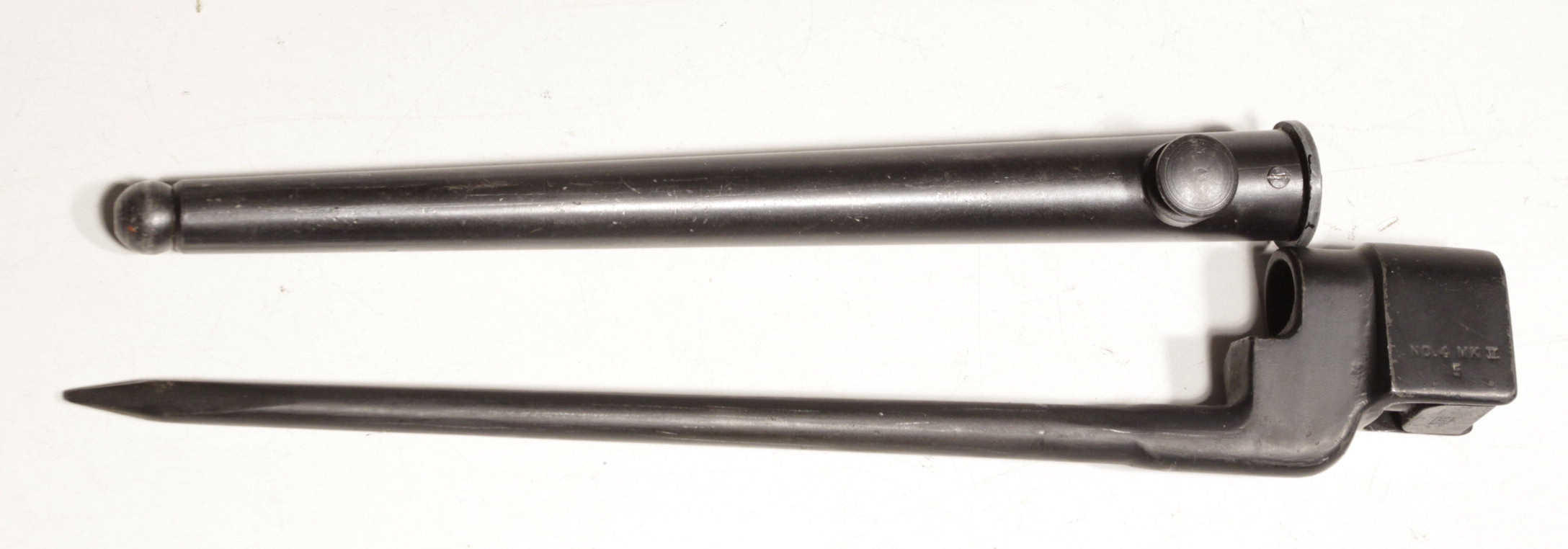 Lee Enfield spike bayonet made for No. 4 Mk 1 rifle. Manufactured on contract to England by Savage Stevens, USA, early in WWII. Small S marking on socket. Large S in square on release. Standard steel Mk 1 scabbard, unmarked.