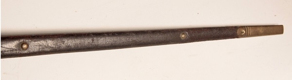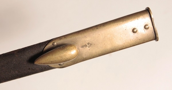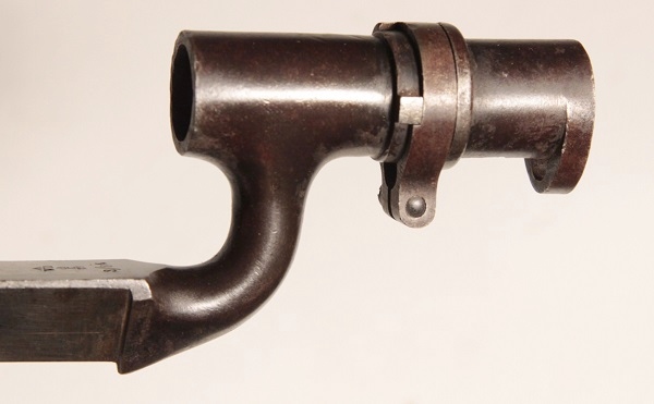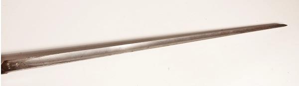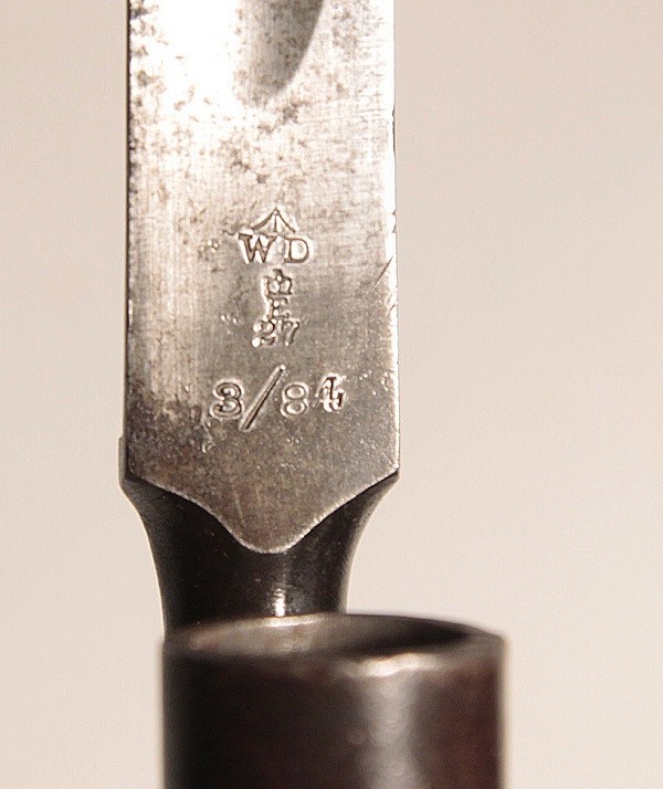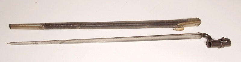 Triangular blade 22 inches long socket bayonet for Martini Henry rifle. Original, very good condition. War Department mark with Enfield 3 line inspectors mark and dated 3/84. Complete with scabbard, leather is sound, brass hardware, marked with WD broad arrow and inspectors mark. Bayonet in very good condition.