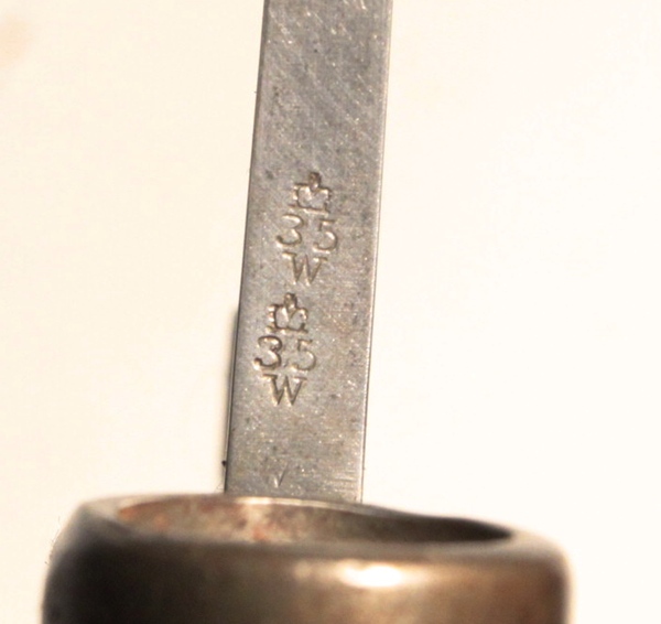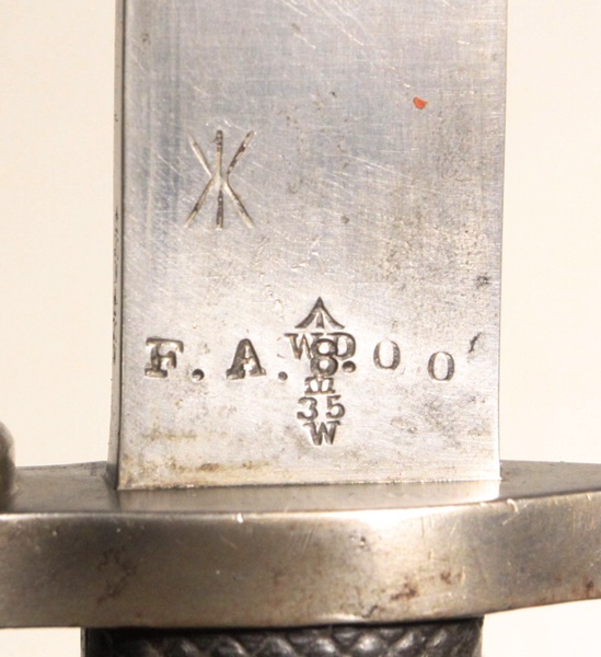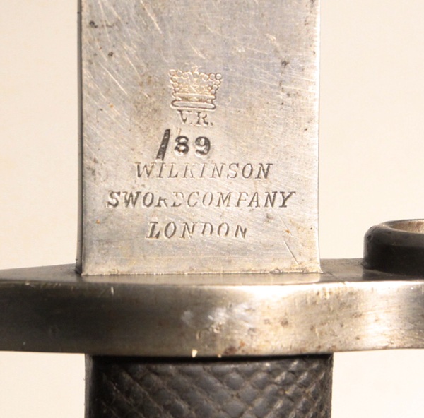British manufacture dated 1889 (/89) with crown over VR and maker name Wilkinson Sword Company London. Opposite side has broad arrow WD and Wilkinson inspection mark clear on ricasso, overstamped with F.A. 8.00 indicating service in India. Inspection mark clear on spine of blade. Rubber grips are very good. No number marked on crossguard. Throat of locket has markings. Blade is Mk III unfullered in very good condition. Steel mounted leather scabbard is very good condition.
