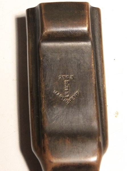 Very uncommon rear sight cover for the Martini Henry rifle. Marked 2843 Martini Henry Patent. No broad arrow or WD marking. Brass with dark finish. Very good condition.