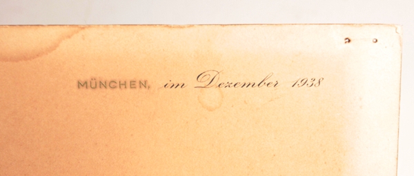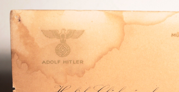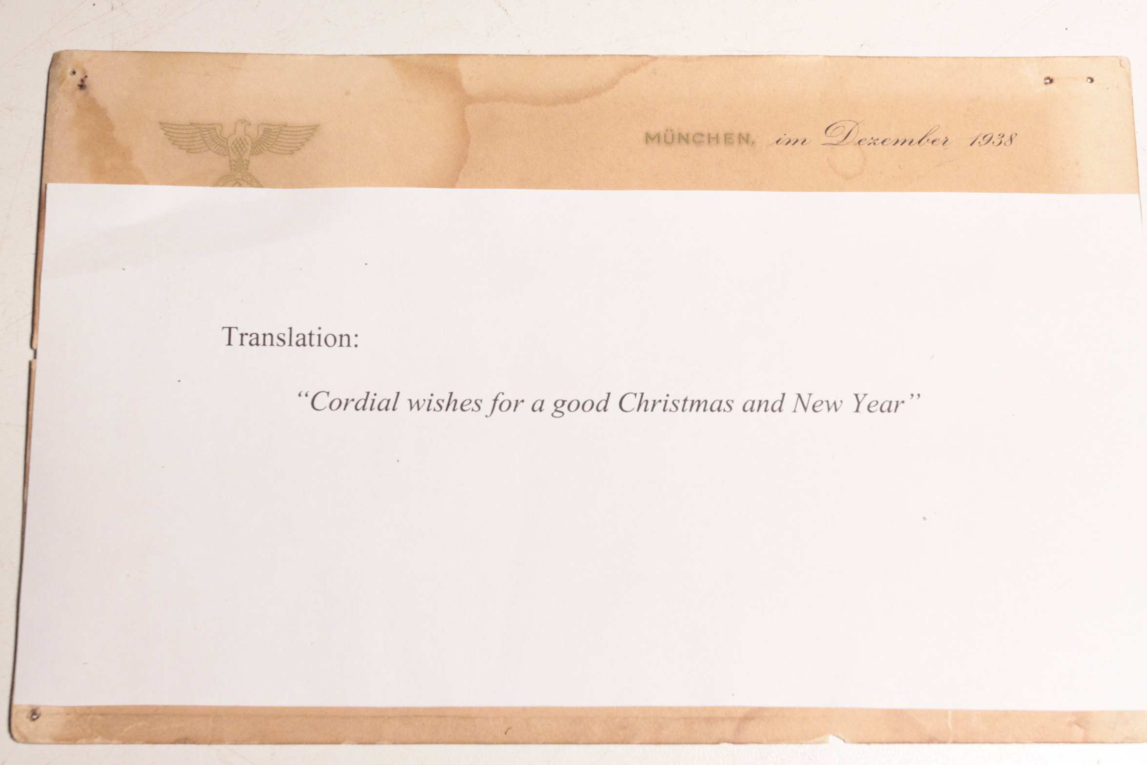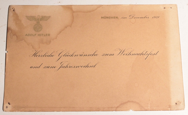 Original Christmas card from Adolf Hitler, Munich 1938. “Cordial wishes for a good Christmas and New Year”. Shows some old water damage at edges as shown in photos. Corners have pin holes.