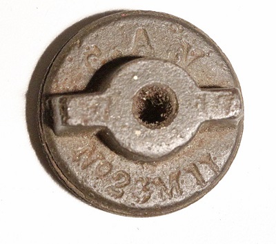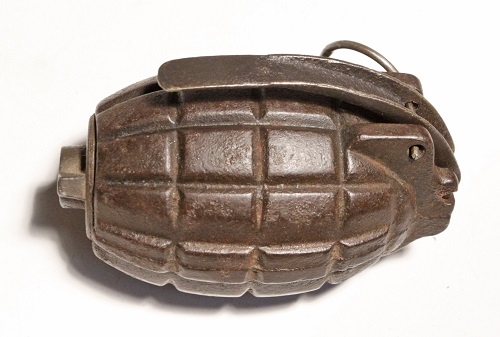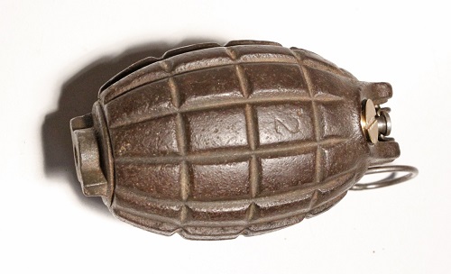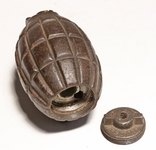 WWI Mills Bomb No. 5 grenade. Original grenade body restored with filler plug, reproduction striker and spring. Original lever and pin. Fitted with No. 23 base plug as used for rod firing from grenade launching rifle.