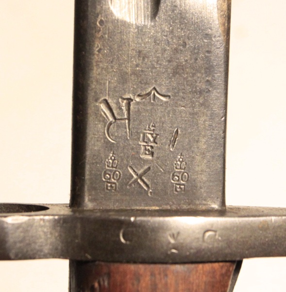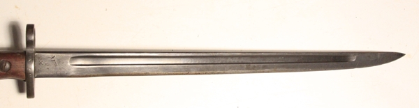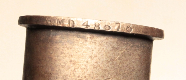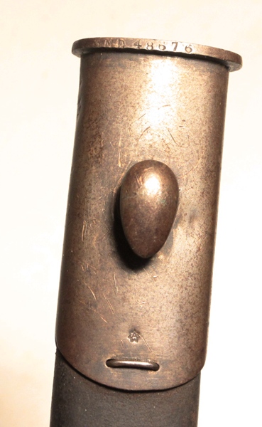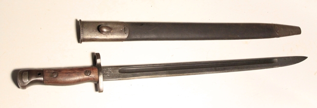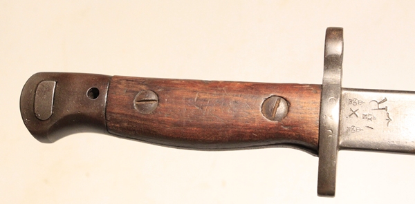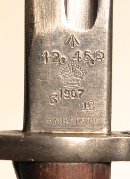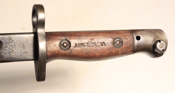 British made by Sanderson, Australian use with D arrow D on crossguard, AUSTRALIA on grip. Well marked on ricasso Crown over GR, 3.18 production and refurbished 12.45. Scabbard has Australian A in star marking and edge of locket is marked third Military District (3MD) with serial number. WW1 tear drop frog stud.