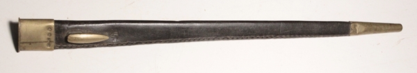 Brass mounted leather scabbard is the early type, manufactured 1853 – 1860, with separate frog stud and locket secured by indentations and shellac. Seam is on side of scabbard instead of on the back. Very good condition with marking stamped into leather below frog stud but is illegible, should be broad arrow WD. Correct scabbard for bayonet mounted on Pattern 1853 Enfield rifled musket.