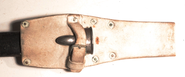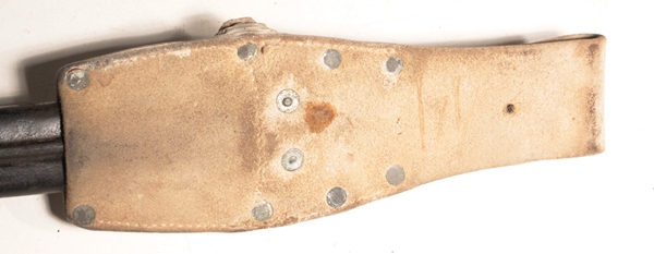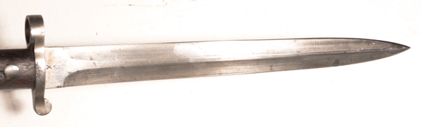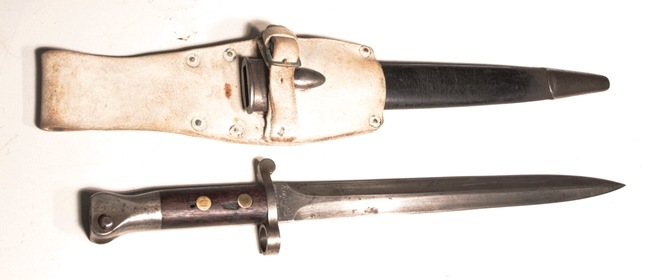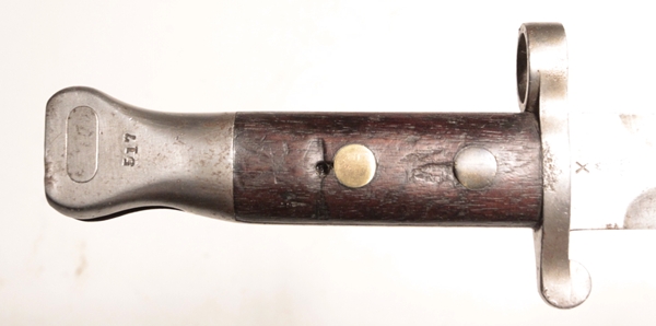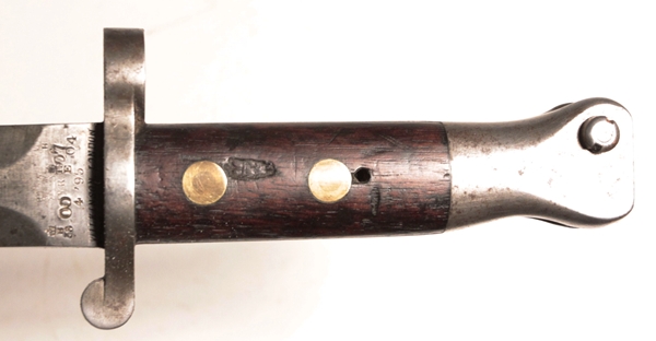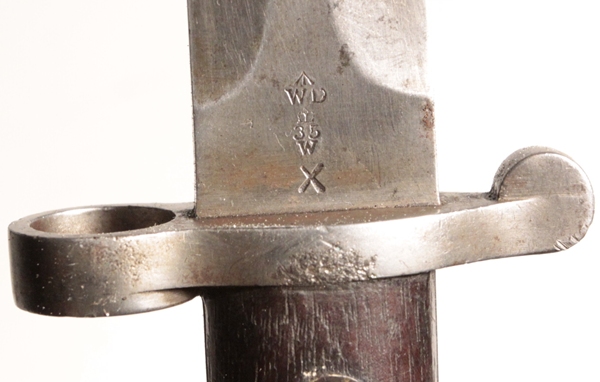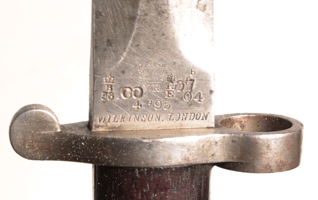 Issued and used bayonet fits Lee Metford or Lee Enfield No. 1 rifles. Mk I Second type with cleanout hole in handle and hole in pommel to take cleaning rod. Crown over VR marked, 4, ‘95 original date (April 1895) with numerous proofs and other dates of modification showing the travels of this bayonet. Maker Wilkinson, London. Opposite side shows Broad arrow over WD with Wilkinson proof and bend mark. Comes in British general service buff leather frog.