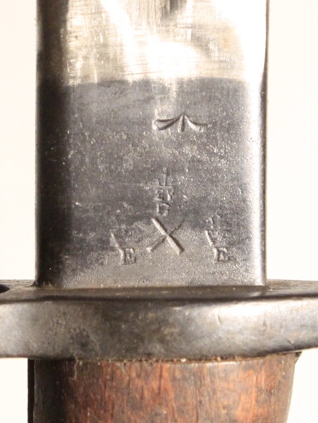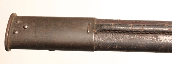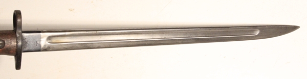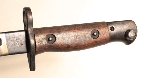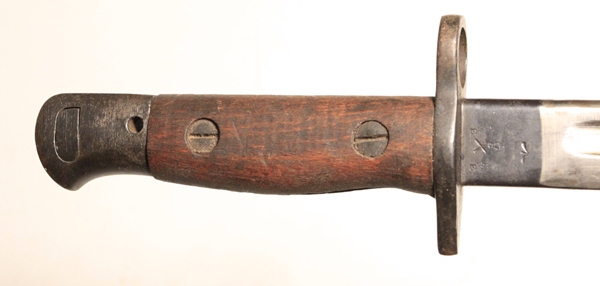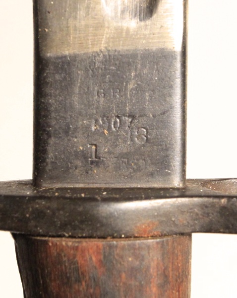 Original British maker SANDERSON still visible on WWII reconditioned blade along with most markings including Crown GR, bend mark and Enfield proof. Comes in Australian scabbard, round frog button, OA marked locket and leather marked Mangrovite 43.