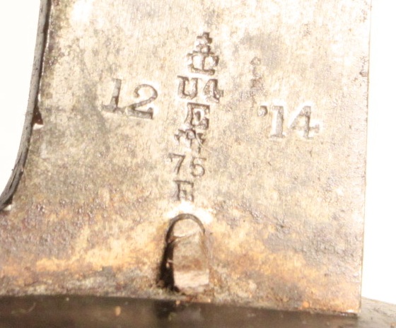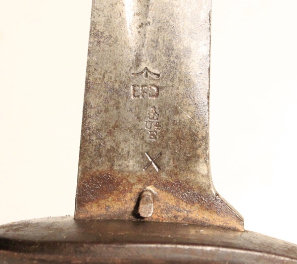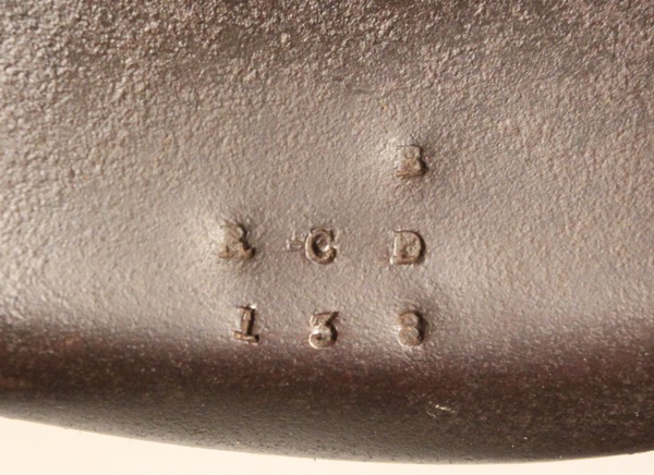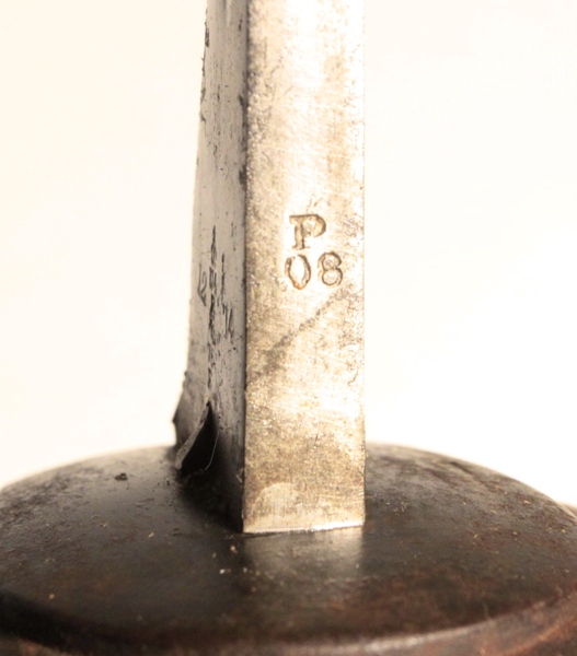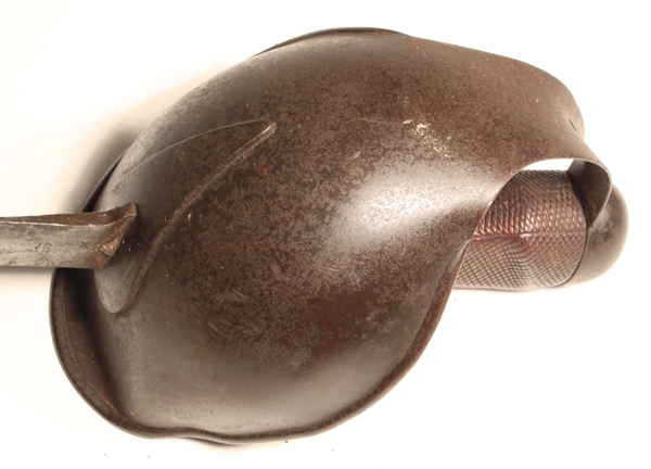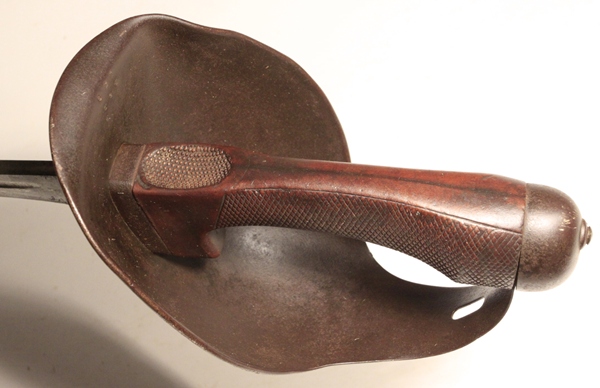 Original Pattern 1908 Cavalry Trooper’s Sword marked on bowl B over RCD over 138 possibly meaning it was carried by Royal Canadian Dragoons who served in WW1 as part of the Canadian Expeditionary Force. Broad arrow over EFD (Enfield production), Enfield proof and “X” bend mark. Opposite side shows British proofs and a date of December 1914 (12, ’14). Blade is very good. no nicks or corrosion. Scabbard has Broad Arrow, EFD Enfield maker mark, British proofs and a date of 15 (1915). Retains original beige colour paint.