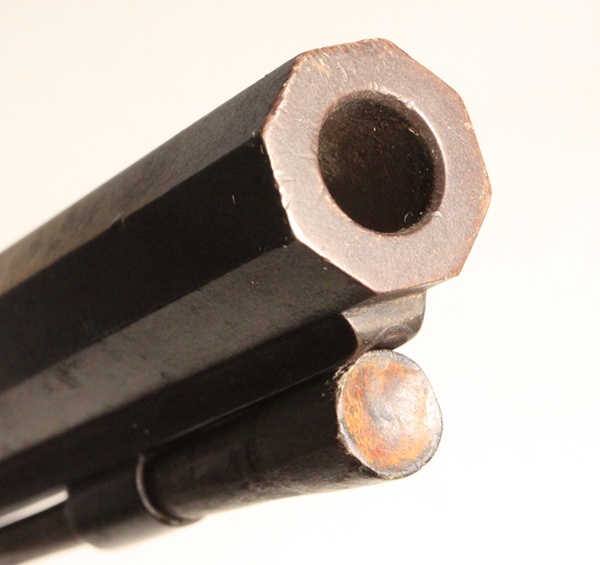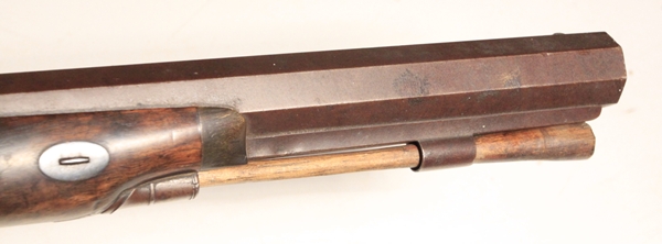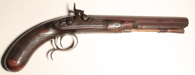 Very well made with fine craftsmanship circa early 19th Century. Engraved lock, hammer, trigger guard and other metal fittings including an ornate pineapple motif forward of the trigger guard. One piece wooden stock has finely checkered grip with silver disk inlaid but never engraved. Lock marked Staudenmayer London as is an impressed stamp on the top of the barrel. Original condition percussion lock with safety as if it were a dueling pistol. Safety does not move as it is fouled with powder residue and would require some restoration if desired. Screw heads are in excellent condition and looks like the pistol has never been apart. Octagon barrel 7/8 inch diameter, bore .50 inch smoothbore. Overall length 16 inches. Barrel is 10 inches. Action functions crisply with a hair trigger. Wooden ramrod. Antique firearm, no licence required to purchase or own.