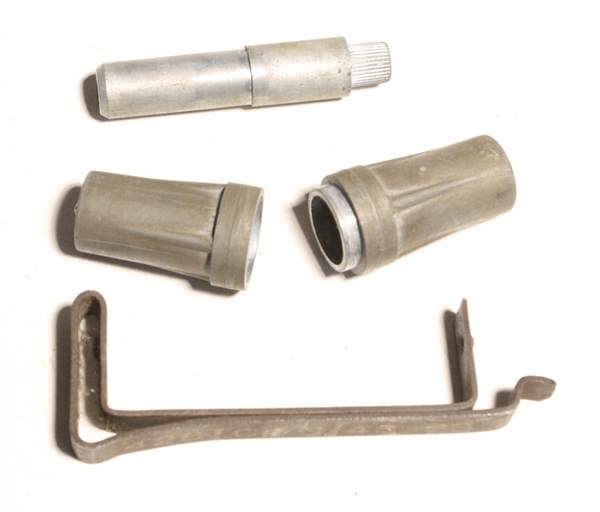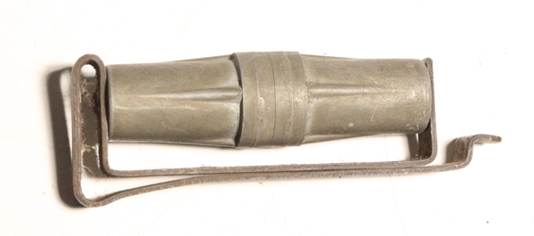 Fuze for PIAT rouind is held in a cast metal holder clipped to the tail of the round using a spring clip. Fuze holder 2 inches long and contains an inert fuze.