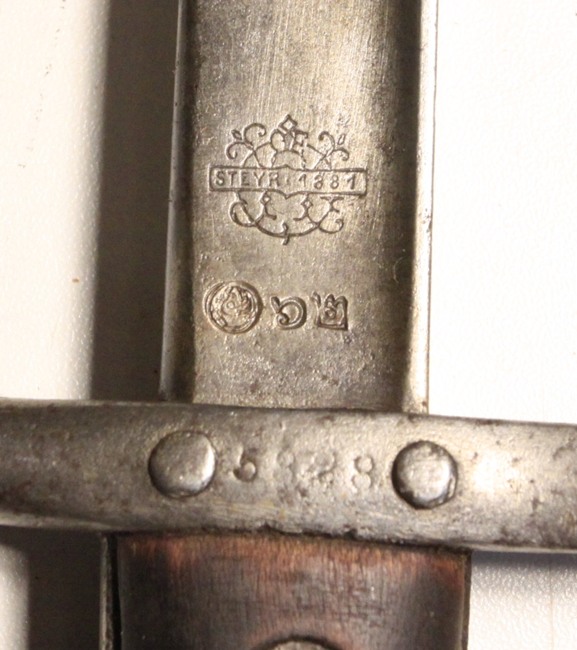 Manufactured by Steyr for the M1879 Peabody Martini rifle. While this rifle was primarily used by Romania there were about 2,000 exported to Siam (Thailand). A copy of the French M1874 Gras rifle bayonet but without step on the handgrip. 20 ½ inch blade and marked with the Steyr logo on the ricasso with date 1881. Non adjustable muzzle ring and crossguard is fastened with 2 rivets. Blade in very good condition. Ricasso has Steyr logo with STEYR 1881. Below that is the Kodchasri property mark of the Siam Defence Division.. Steel scabbard is blued in good condition with evidence of corrosion.