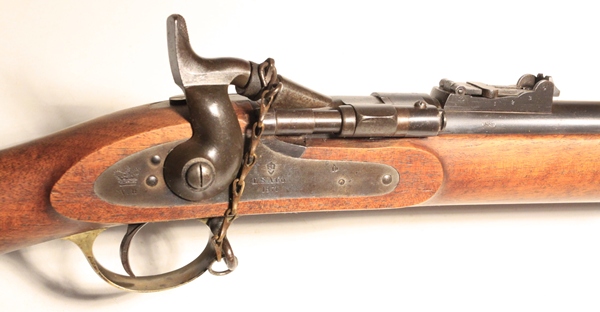 Lock clearly marked Crown/VR, L.S.A. Co. 1871. WD marked with numerous proofs. London stock cartouche is very clear with clear DC marking on opposite side. Bore is excellent. Complete with firing pin protector. Antique firearm, no license required to purchase.