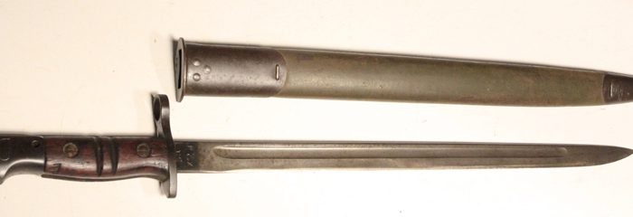 Swagger stick with blade inside twist locking leather covered scabbard. Blade is 14 inches and decorated with dotted scrollwork and maker marked. Overall length 24 inches. Likely made in India.