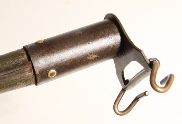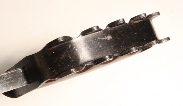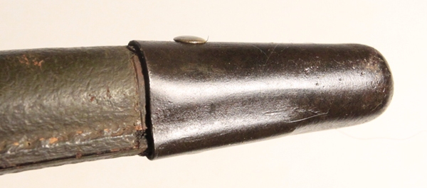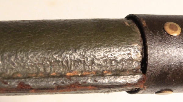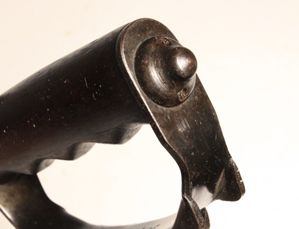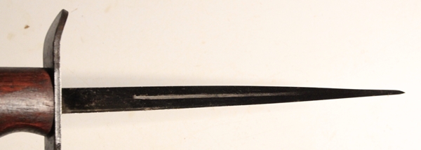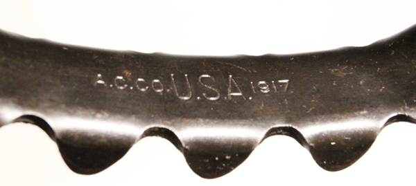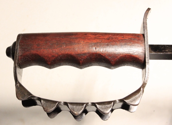 U.S. WWI Trench Knife M1917 with heavily serrated edges running down each side of the handguard. Blade is 9 inch triangular blued steel tapering to a very sharp point intended to puncture heavy clothing. Maker is stamped into the underside of the hand guard A.C.Co. USA 1917 (American Cutlery Company of Chicago). Scabbard is steel mounted green leather maker marked JEWELL 1918. Overall very good original condition with some surface corrosion to the steel scabbard parts. Blade is very good plus with much original blue, no nicks and only drag marks. Guaranteed original.