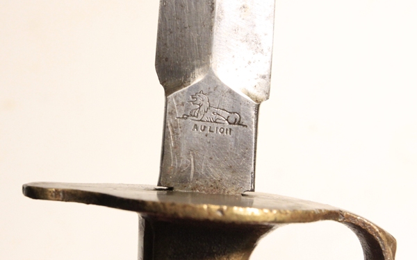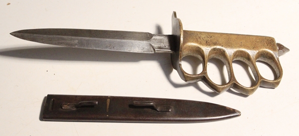 The US Model 1918 Trench Knife, also called a Knuckle Knife because of the large brass knuckle grip intended for trench warfare hand to hand combat. This specimen is guaranteed original and was manufactured in France and is marked Au Lion on the blade with the reclining lion logo. The US made versions probably never saw action in WW1 but the French made knives did. This specimen is in very good condition as pictured and has original steel scabbard. Blade has no blue finish remaining. Scabbard is in very good condition with blue remaining.