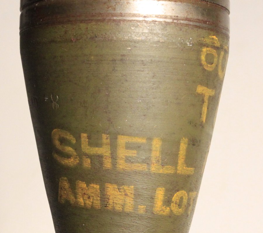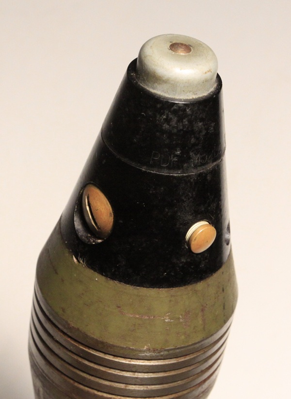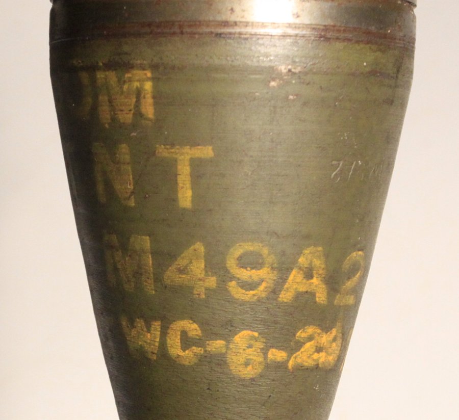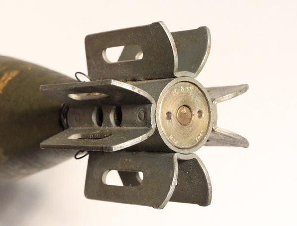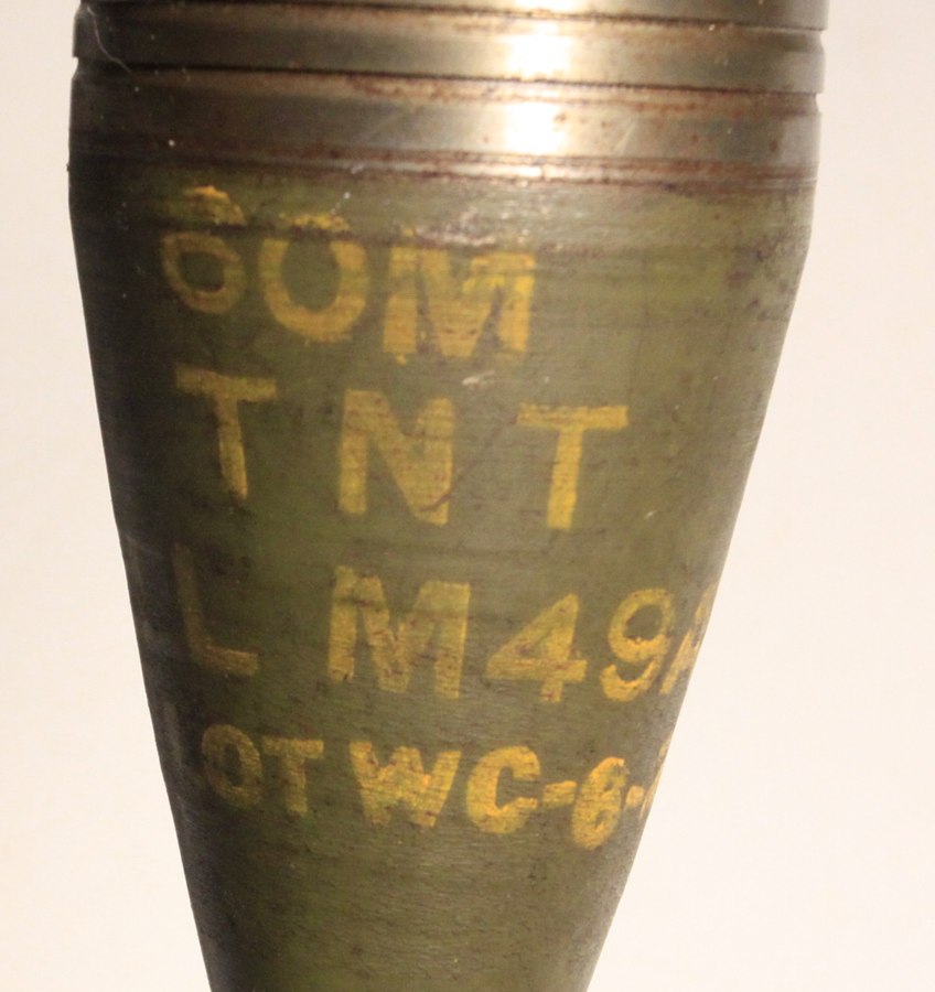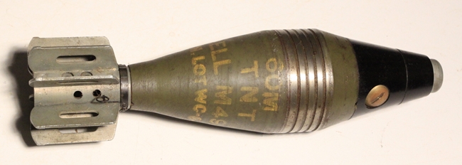 Superb inert display example of US High Explosive Fragmentation fin stabilized mortar bomb.