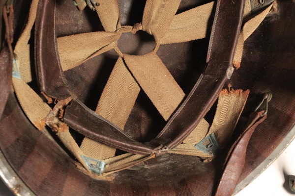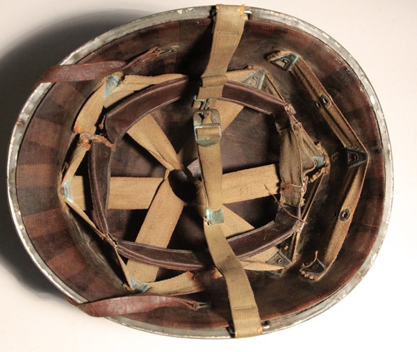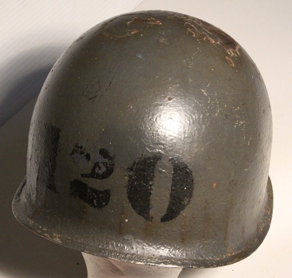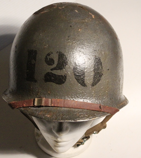 Original US M1 helmet as used by US Navy. Original green paint visible inside helmet while the exterior is covered in several layers of battleship grey and bears numbers on the front and rear of the helmet shell. Original fixed bales and chinstrap with brass tabs. Liner is early model with vent hole in front and leather chinstrap intact. Liner shows wear and tear with some minor deterioration as shown in photos, maker marked at dome. Great M1 helmet variant.