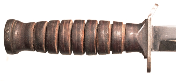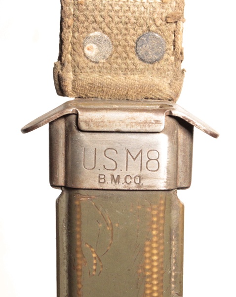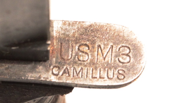 Original US WWII M3 fighting knife made by Camillus Cutlery and marked on crossguard US M3 CAMILLUS, the 3rd type of marking which was done on 1944 production knives. Pommel marked with flaming bomb. Scabbard is US M8 by B.M. Co.