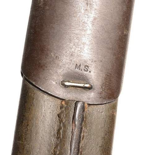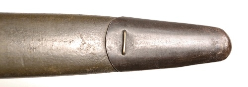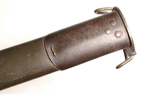 Original 2nd pattern P17 scabbard. Painted green for WWII use. Leather scabbard is marked on back with maker name Jewell and date is obscured by paint but should be 1918. Throat piece marked MS. Original wire belt loops.