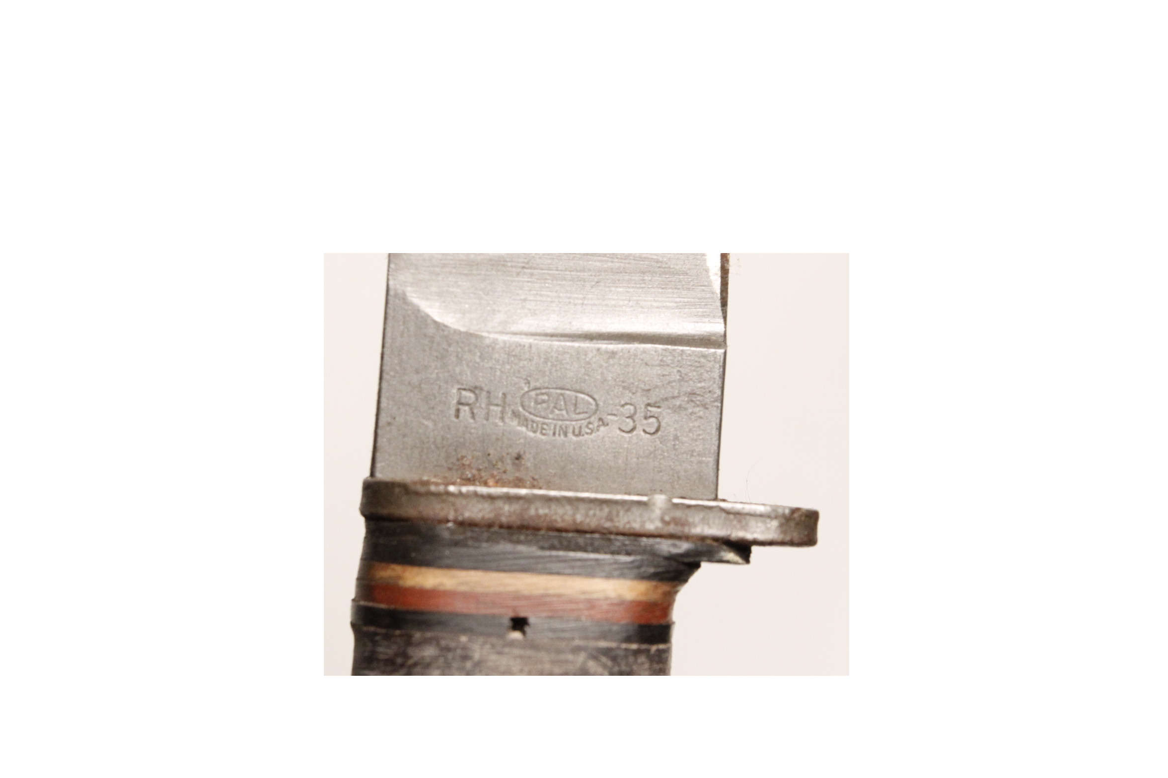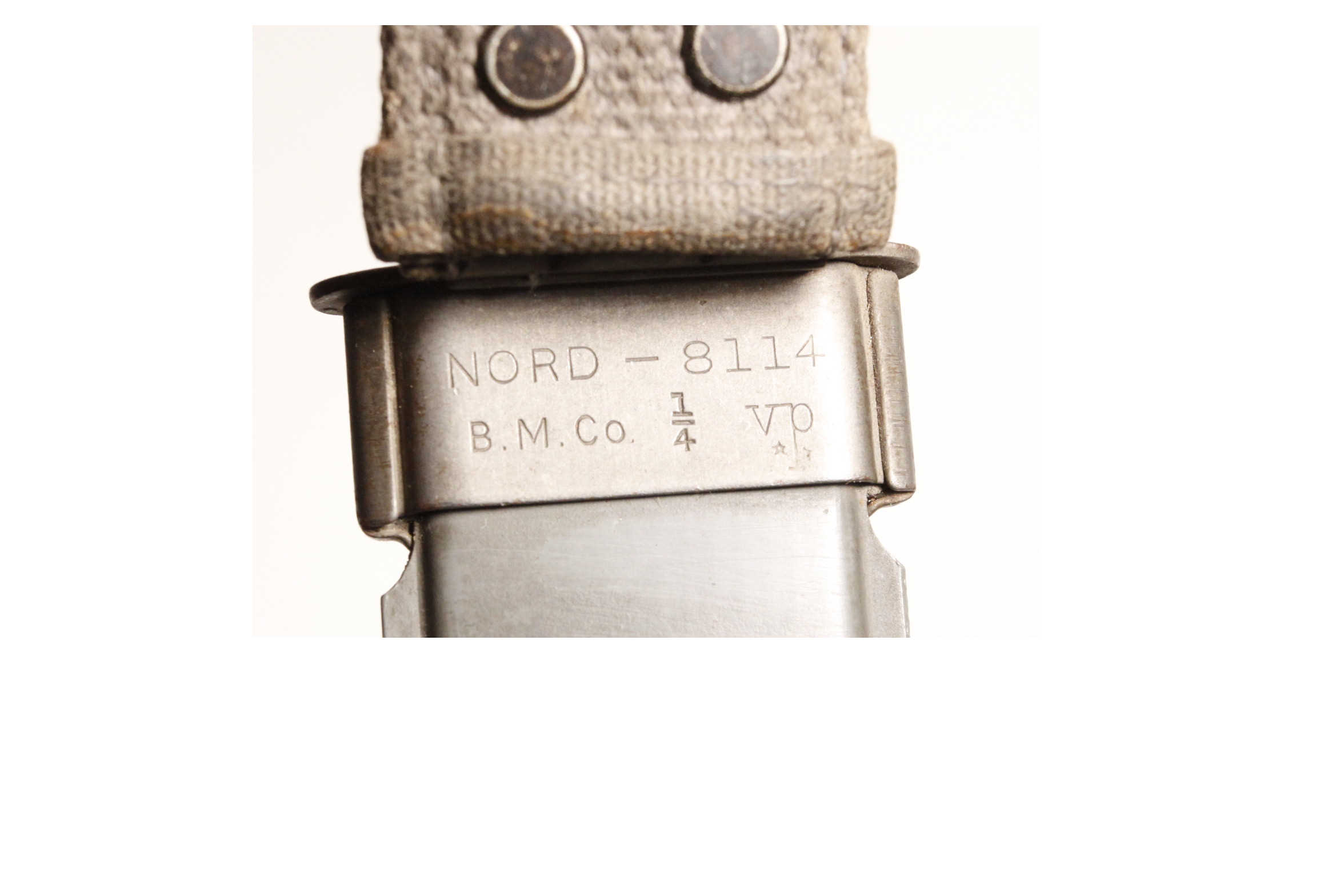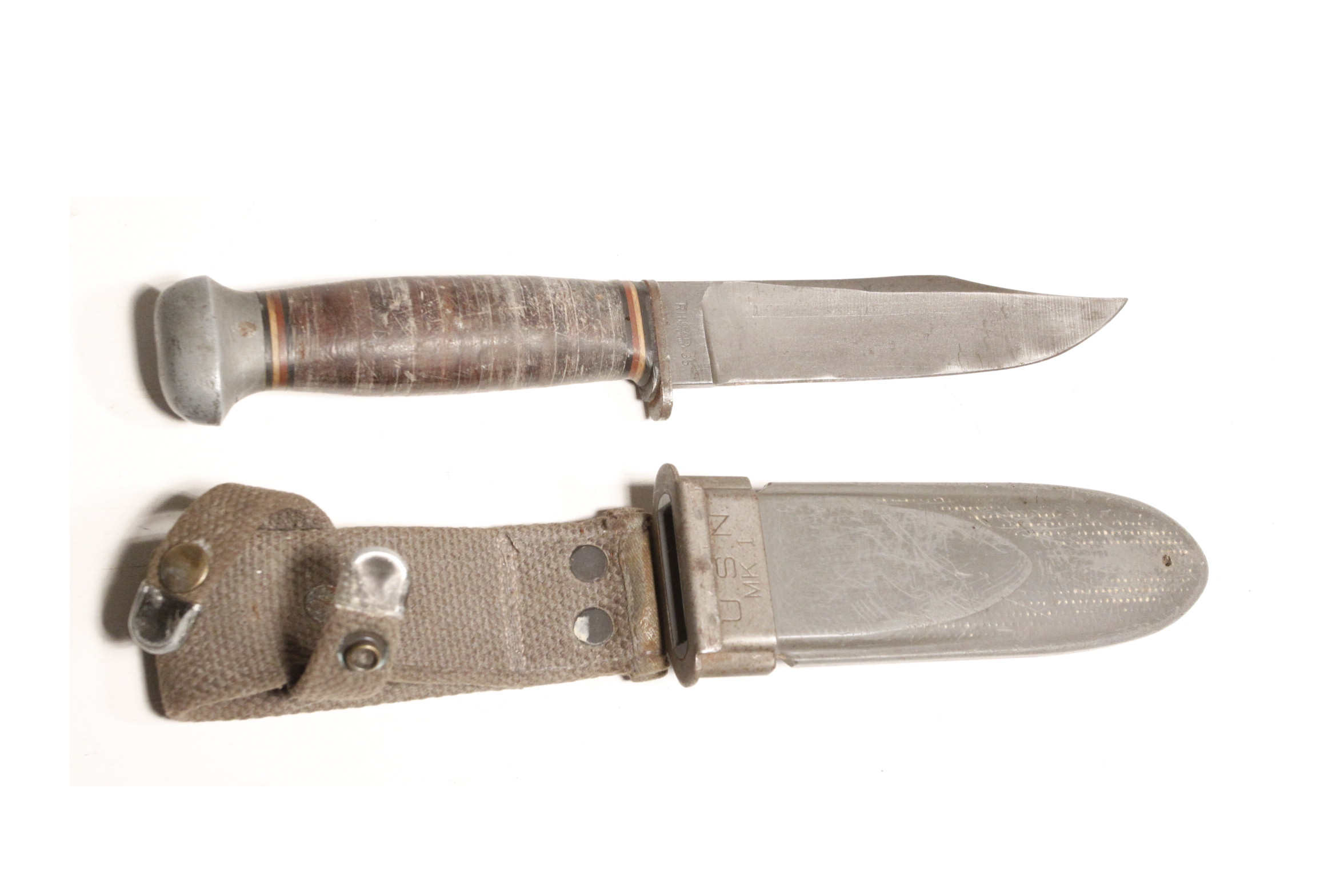 Original US Navy Mk 1 knife with 5 inch blade in original scabbard. Left side marked U.S.N. Mk 1. Right side RH-35 with PAL logo in oval for PAL Cutlery. Scabbard is original WWII Mk 1 with marking US Navy contract number NORD 8114 and B.M.Co. for Beckwith Manufacturing Company. The vp logo is Victory Plastics.