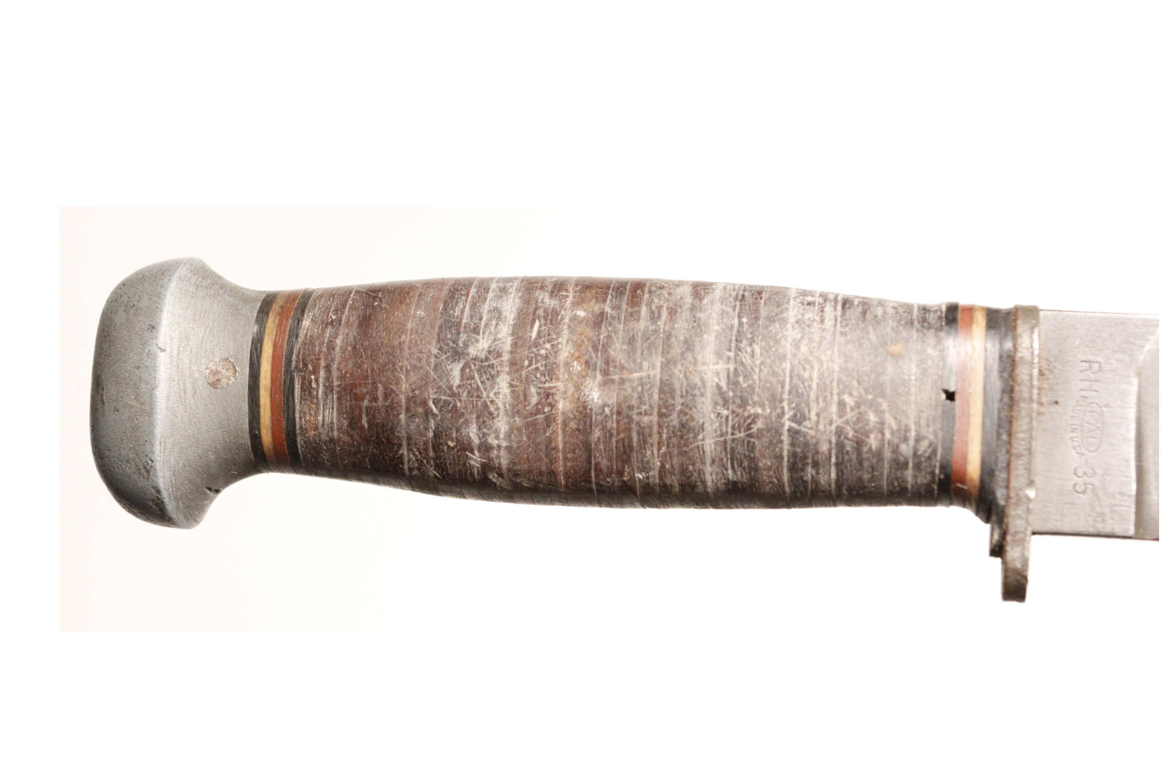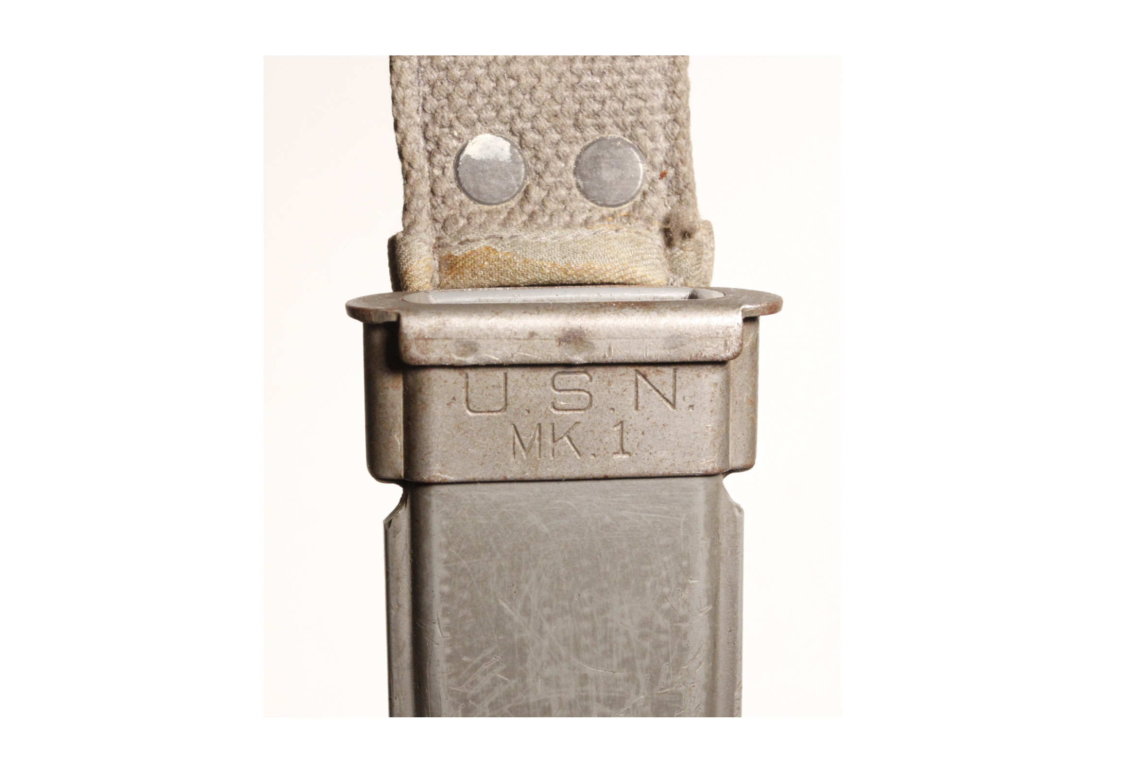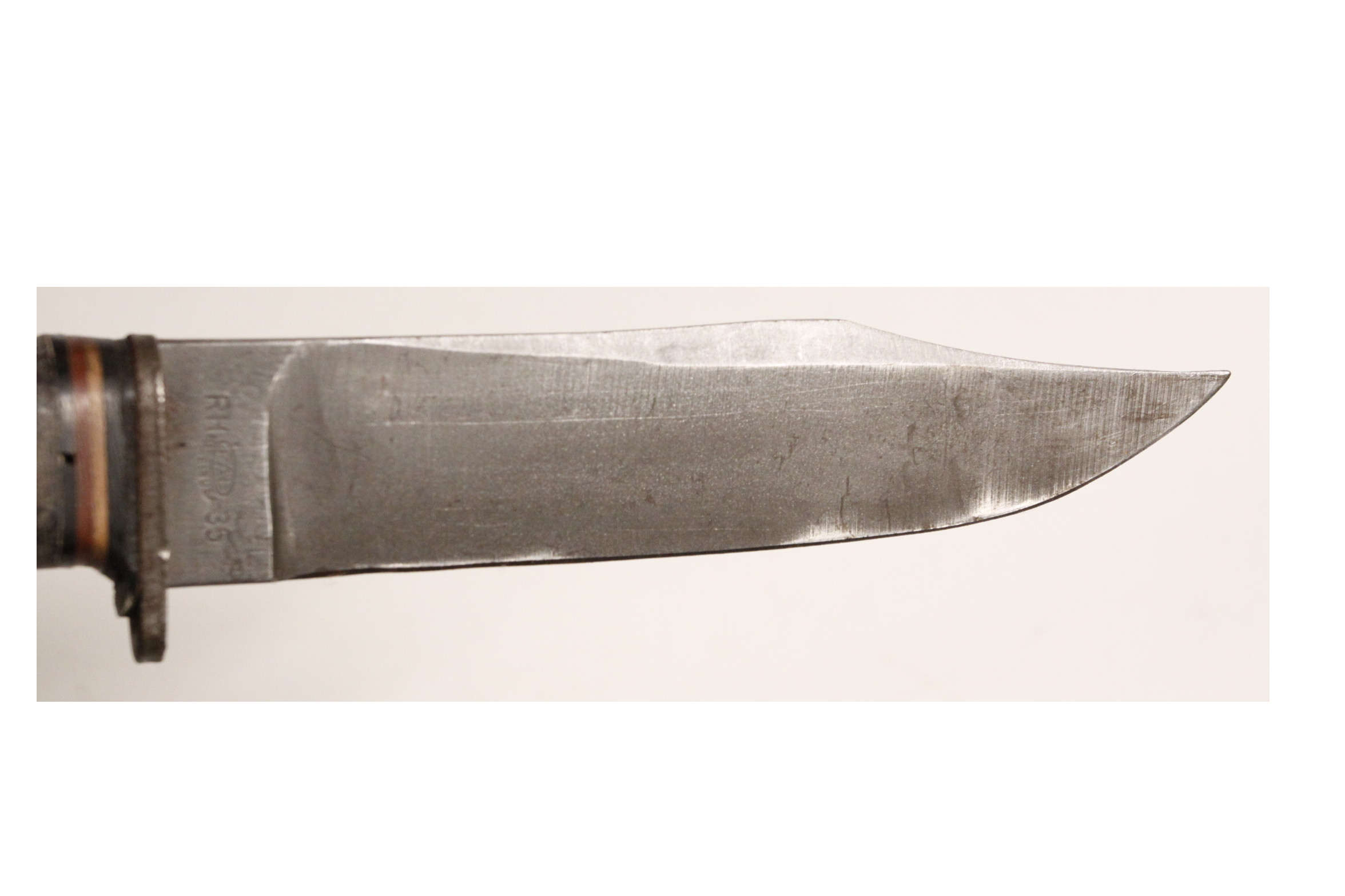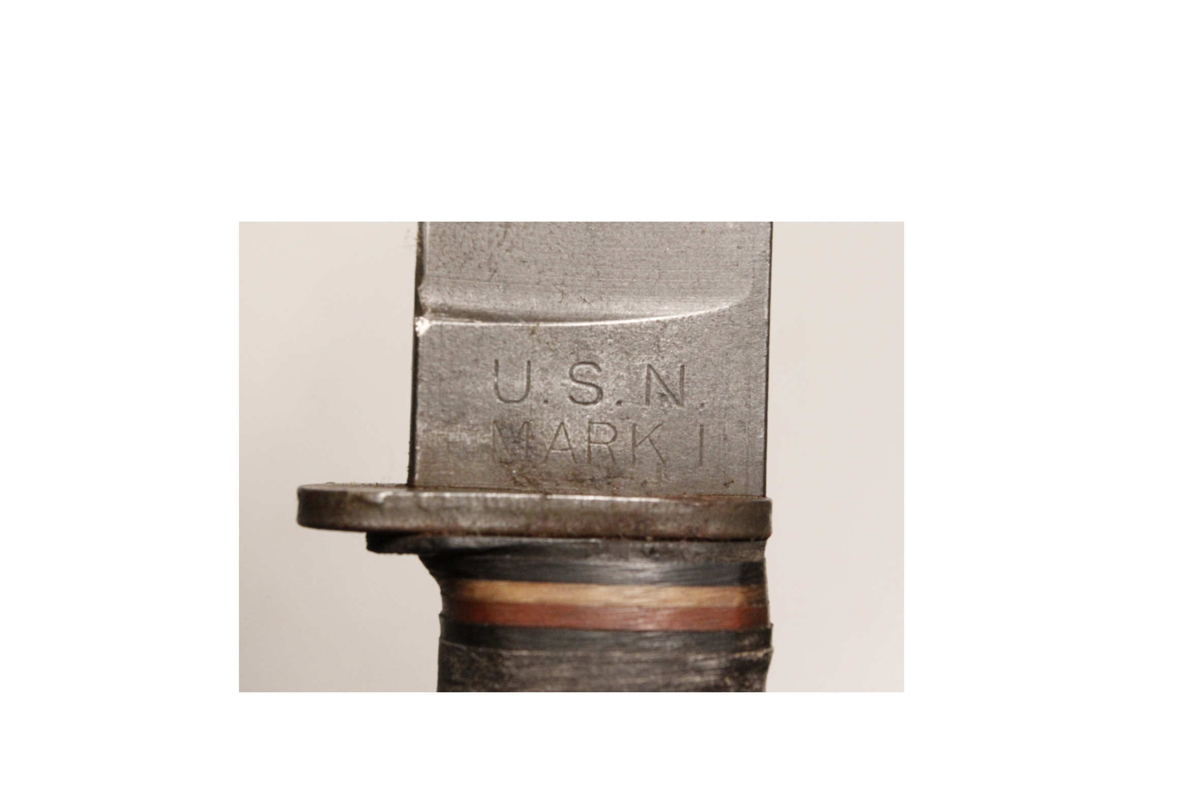 Original US Navy Mk 1 knife with 5 inch blade in original scabbard. Left side marked U.S.N. Mk 1. Right side RH-35 with PAL logo in oval for PAL Cutlery. Scabbard is original WWII Mk 1 with marking US Navy contract number NORD 8114 and B.M.Co. for Beckwith Manufacturing Company. The vp logo is Victory Plastics.